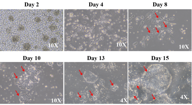 图像显示了重编程过程中PBMC的形态变化和iPSCs的出现。(红色箭头指示形变细胞)